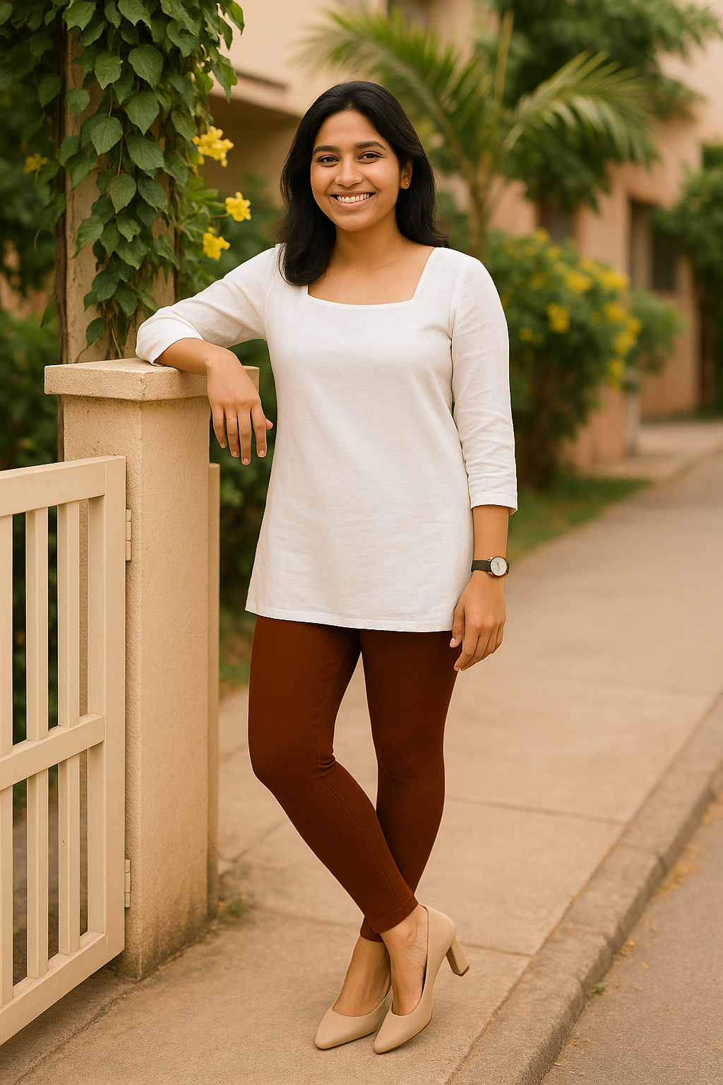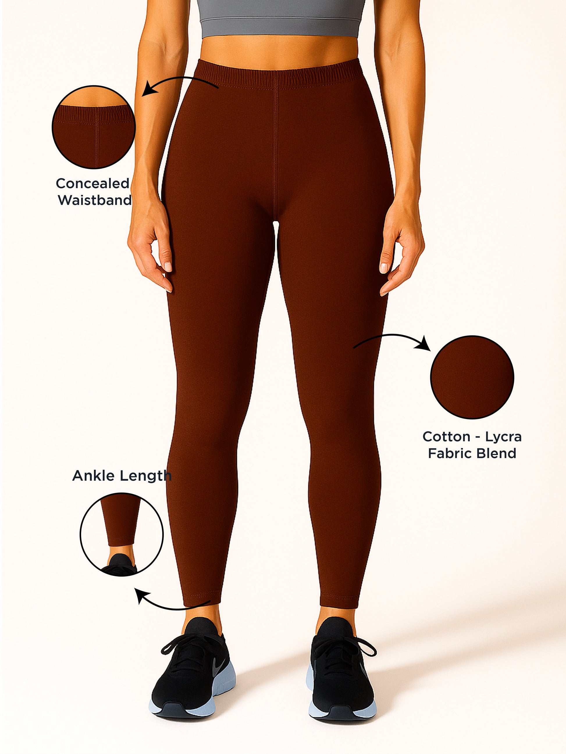 Warm and sophisticated, Auburn Ankle-Length Leggings feature a deep reddish-brown hue that captures autumn's essence. This elegant shade complements a wide range of skin tones and pairs beautifully with soft creams, olives, or golds. Designed with a cotton surface and lycra interior, these leggings offer stretch, breathability, and quick-drying comfort. The soft waistband lies flat against your body, ensuring a secure and smooth fit all day. With a no-pilling finish and long-lasting color, Auburn leggings remain stylish through frequent wear. Whether you're dressing up or going casual, Auburn delivers rich color and reliable comfort for every moment.