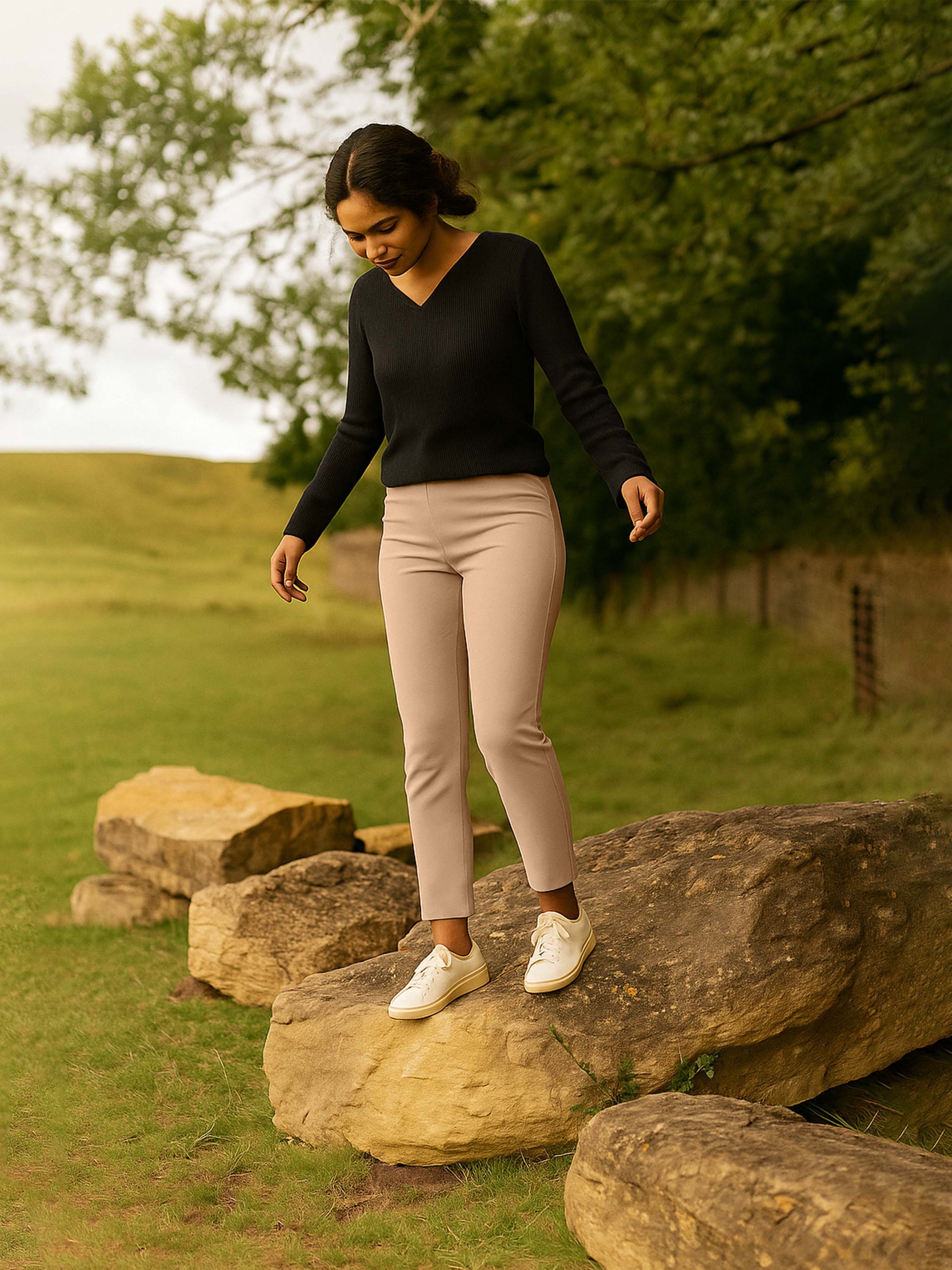 - Earthy tone complements any top—add printed blouses, dark knits, or layered neutrals for a chic, cohesive look.