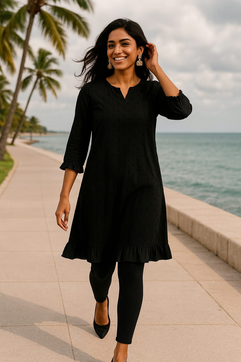 The Black Ankle-Length Leggings are a wardrobe essential—sleek, slimming, and endlessly functional. The rich, deep black complements every style, from casual tees to structured blazers. These leggings feature a cotton surface that’s soft to the touch and a lycra-plated interior for flexible movement and fast moisture absorption. Stay cool and dry from morning meetings to evening errands. The covered waistband sits flat for a seamless silhouette, while the anti-pilling fabric ensures long-lasting wear. Black never goes out of style—and neither will you. A must-have for those who value comfort with a chic edge. Perfect for everyday sophistication and timeless appeal.