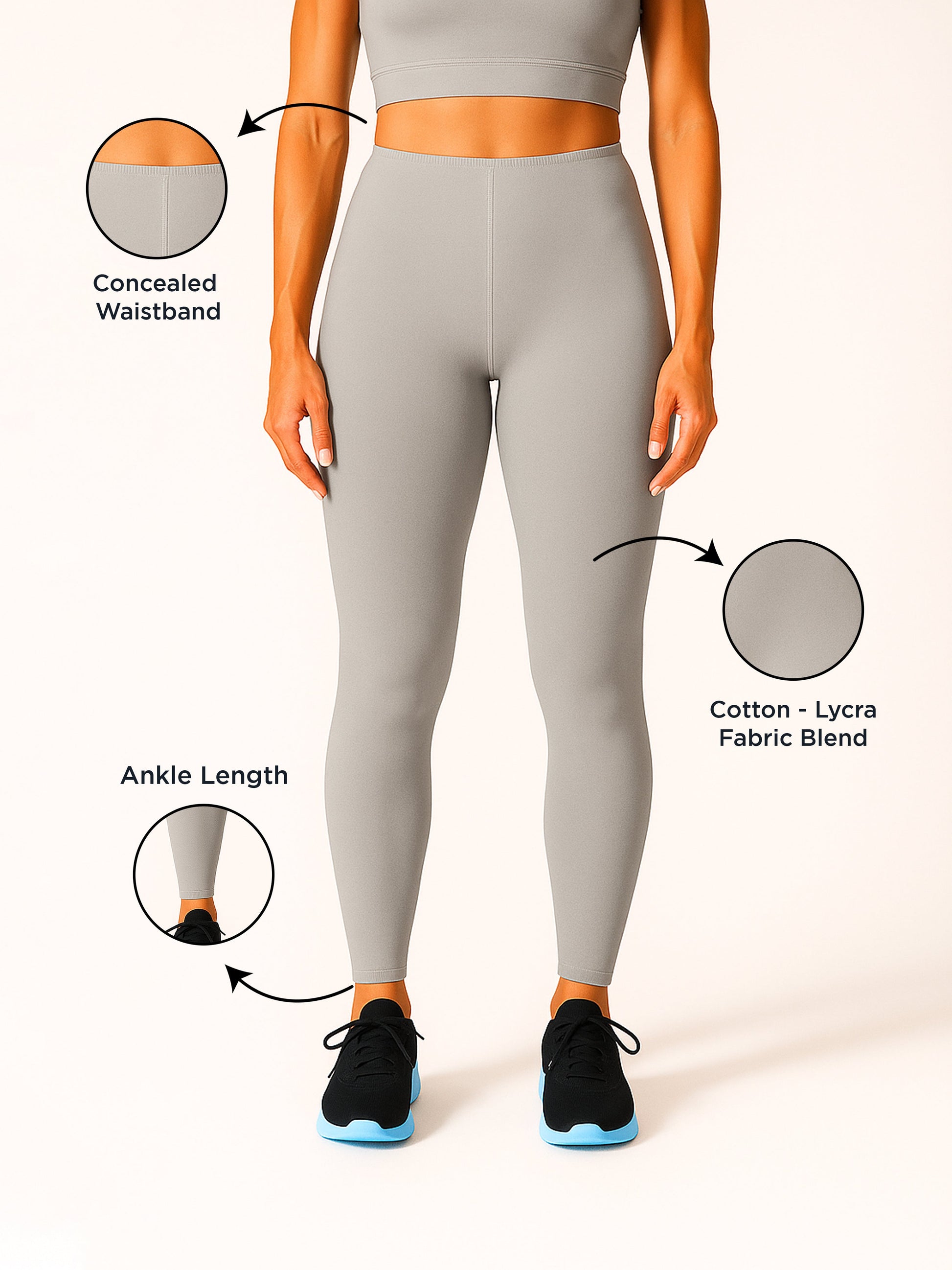 Soft as a whisper, our Cloud ankle-length leggings bring lightness and calm to your everyday wardrobe. This gentle, pale grey-white shade mirrors the softness of a cloudy sky, making it perfect for laid-back, minimalist looks. Made from a breathable, stretch-enhanced fabric, these leggings feel like a second skin and move with you all day. The neutral tone works seamlessly with pastels, darks, and bights alike versatility at its finest. Whether paired with a cozy sweater for lounging or layered under a long blouse for errands, Cloud provides understated elegance. The wide waistband delivers a secure, smoothing fit, ensuring both style and support. Experience the comfort of softness and subtle charm in every step.