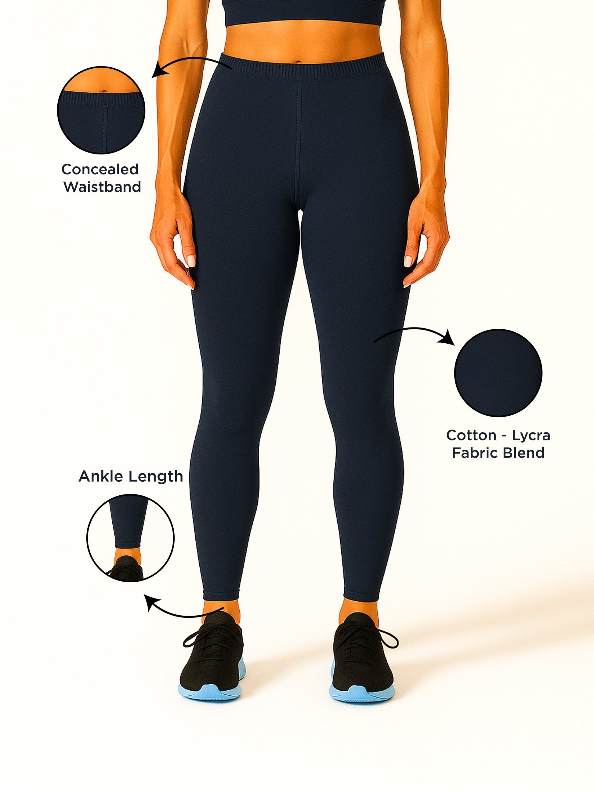 - Denim Blue leggings offer classic cool tones, made with breathable cotton and lycra for moisture-wicking, all-day stretch comfort.