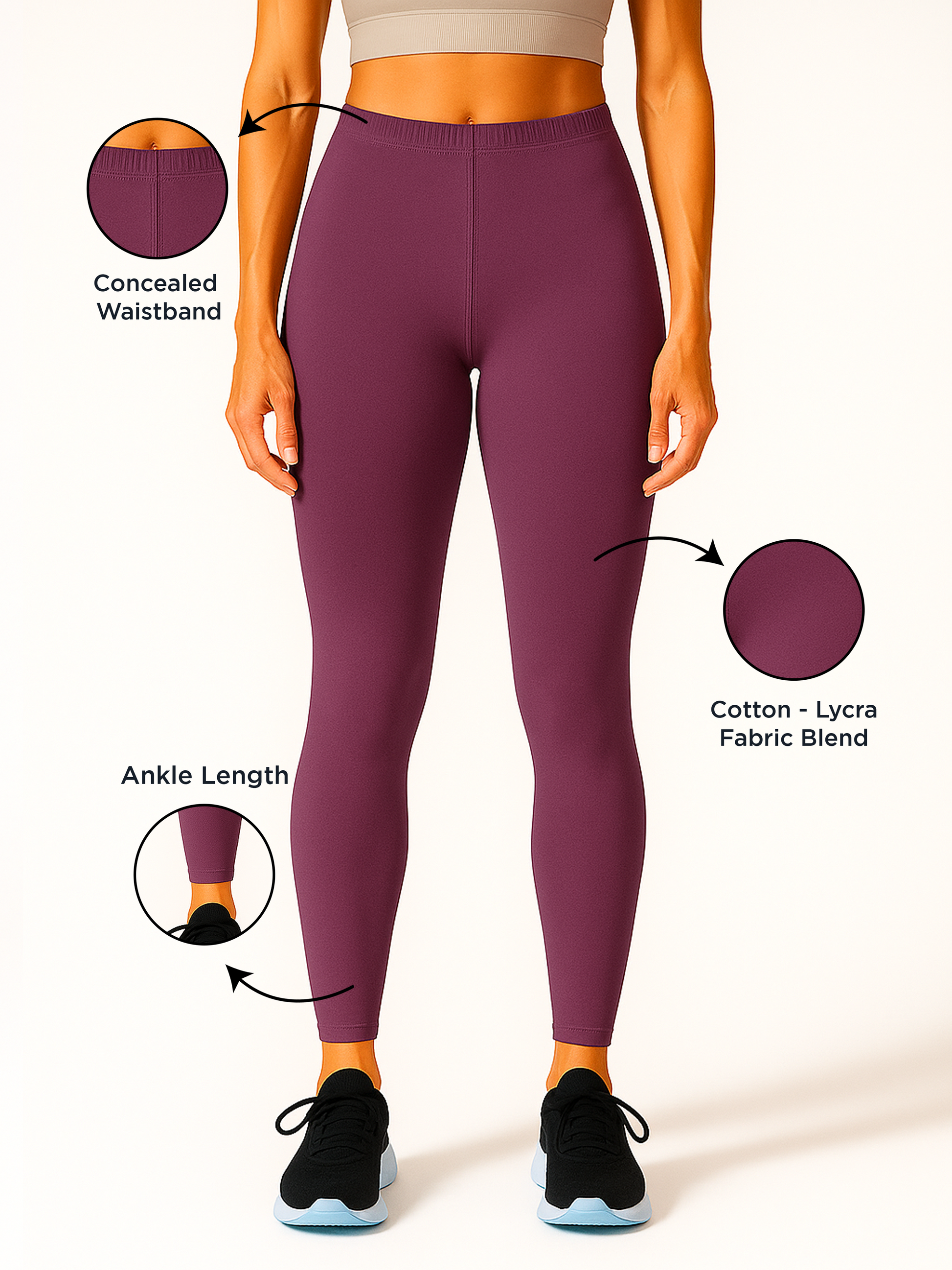 - Deep Dewberry leggings offer rich berry tones with moisture-wicking cotton and stretch lycra for breathable, all-day comfort.