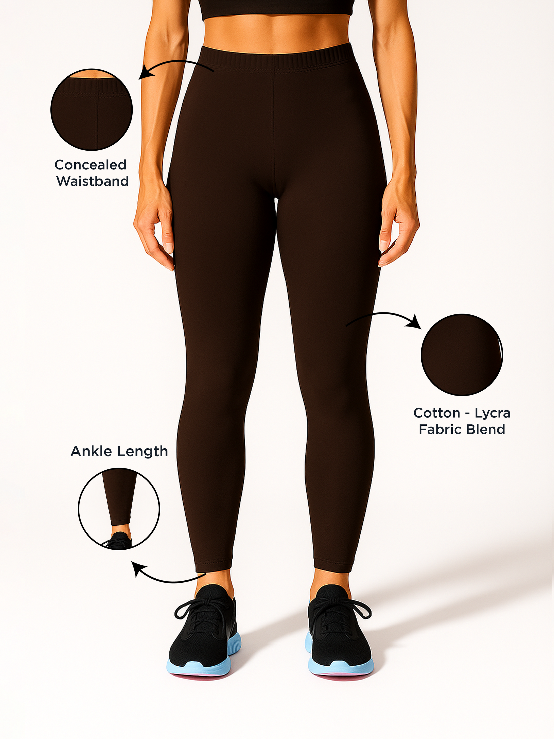Wrap yourself in cozy style with Hot Chocolate Ankle-Length Leggings. This warm, inviting shade brings the richness of cocoa into your wardrobe, perfect for cooler months or earthy-toned ensembles. The cotton surface feels soft against the skin, while the lycra interior ensures stretch and all-day ease. With a fabric-covered waistband for a comfortable, secure fit and no-pilling durability, these leggings are both stylish and practical. Whether paired with oversized sweaters or fitted tanks, Hot Chocolate offers a grounded, natural look. Ideal for cozy days in or casual outings, this color delivers understated charm and supreme comfort.