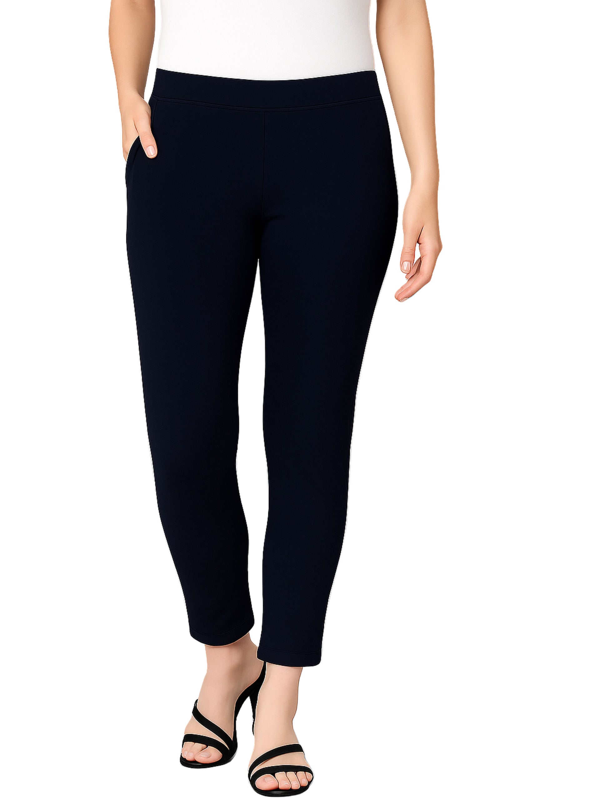 - Timeless navy straight pants offer a tailored, refined look that easily transitions from desk to dinner plans.
