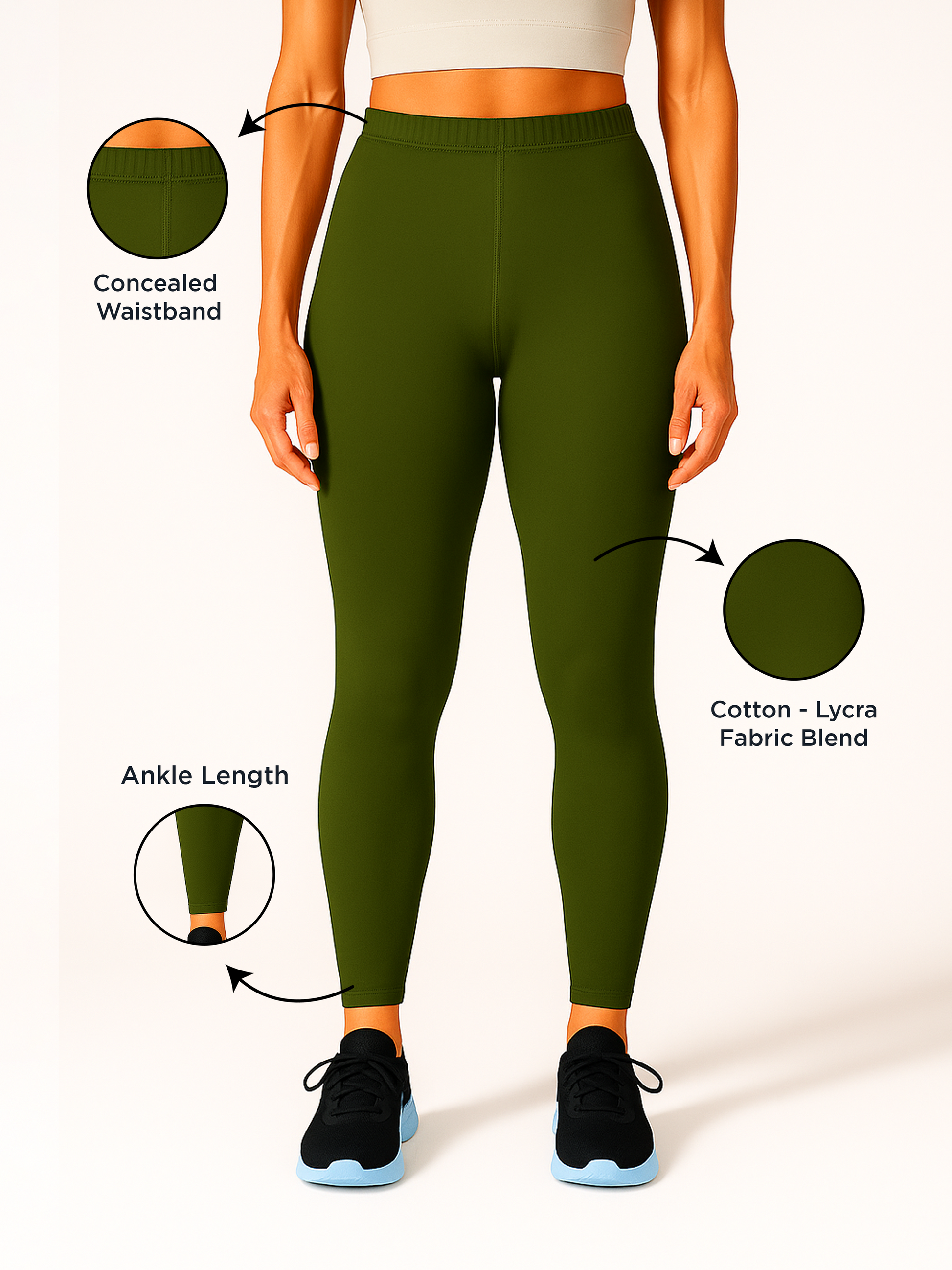 - Earthy Olive Green leggings provide a grounded look, made from cotton and lycra for breathable, moisture-wicking, everyday wear.