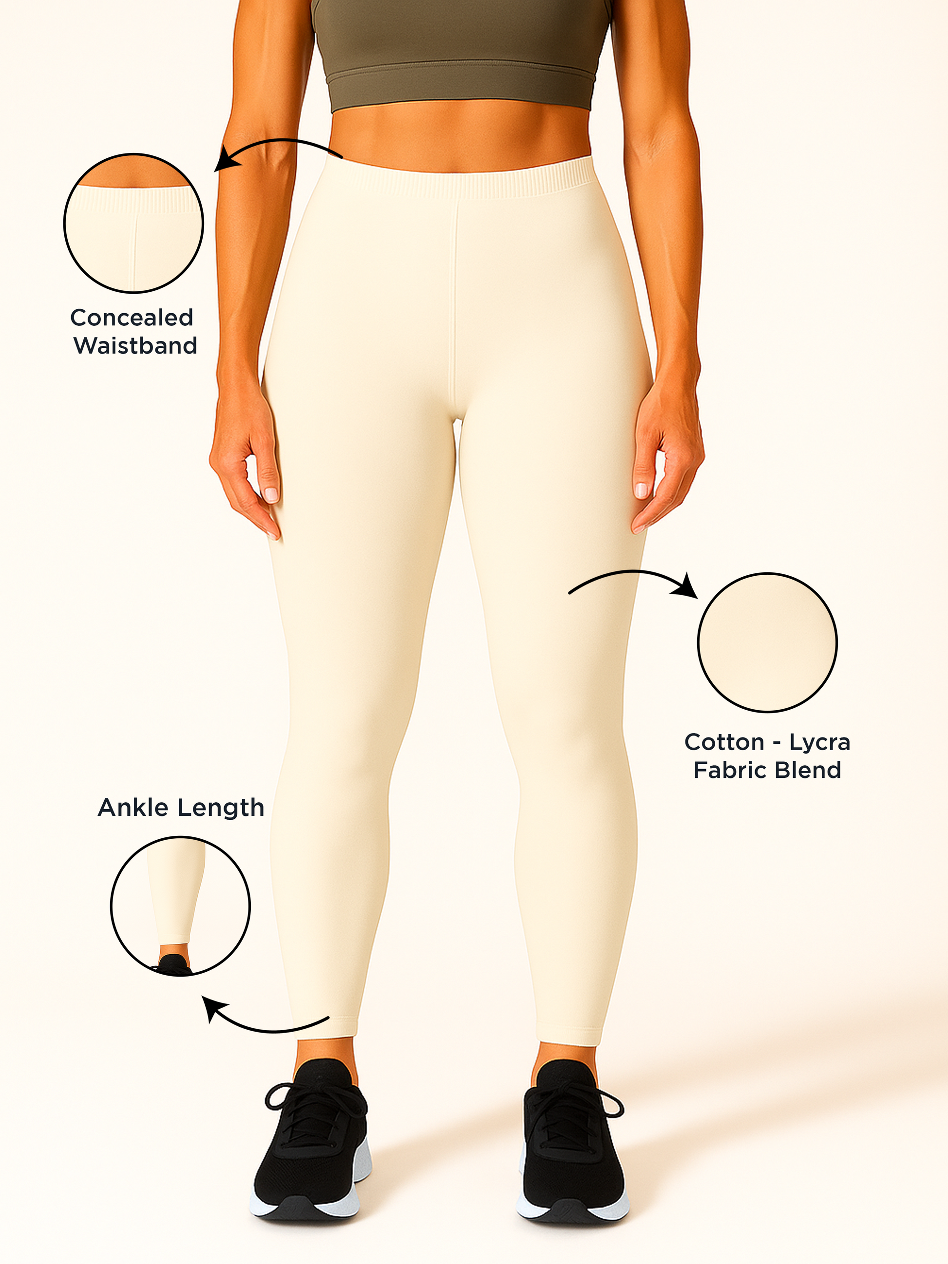 Vanilla Ice is a creamy, soft off-white shade that adds a cool, fresh touch to your leggings collection. Crafted from breathable, stretchable fabric, these ankle-length leggings offer a lightweight feel and flattering fit. The color is crisp and clean, perfect for pairing with bold colors or gentle pastels for a balanced look. The wide waistband provides gentle support and smooth shaping, making Vanilla Ice a great choice for workouts, lounging, or casual days. This shade is a versatile staple that brings understated elegance and comfort to your everyday wardrobe.
