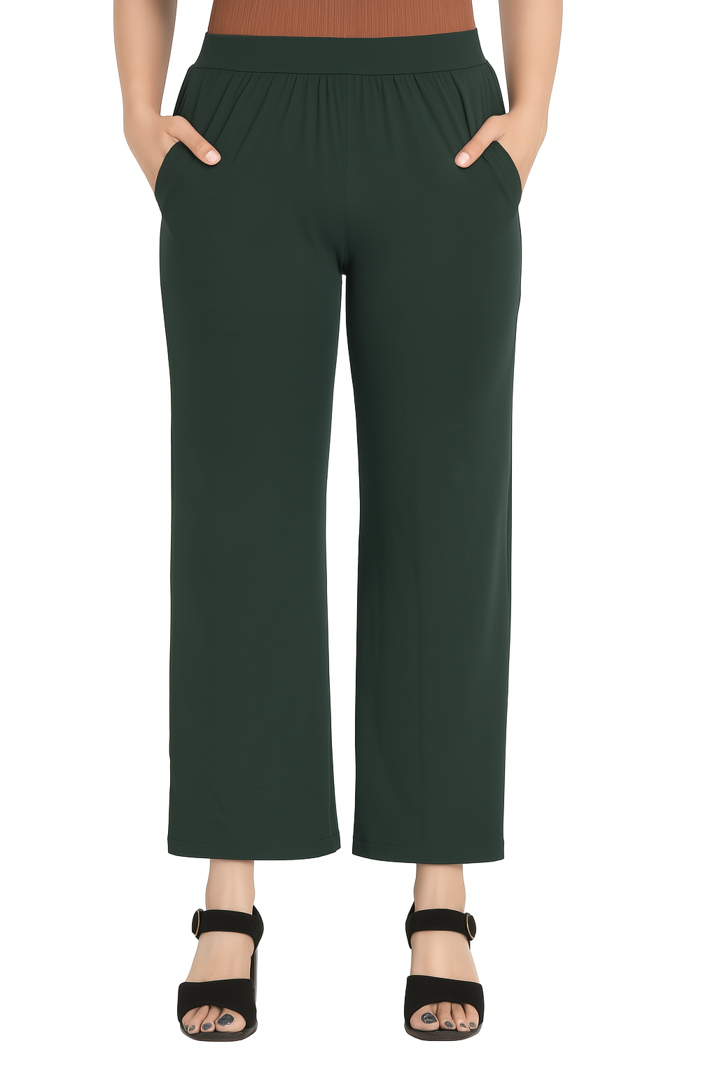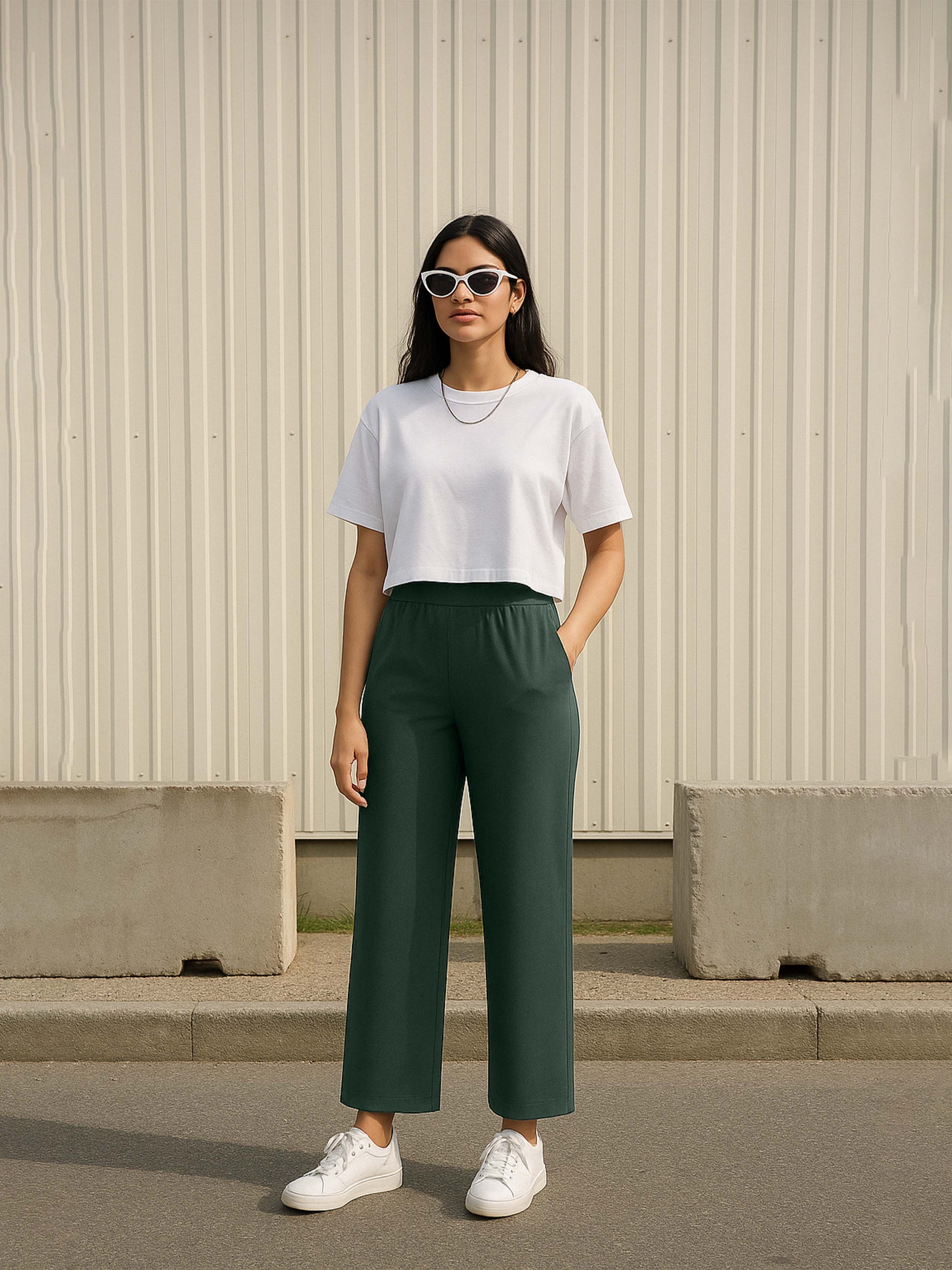 Step into effortless ease with the Women's Solid Bottle Green Relax Fit Pant. Made from a supple stretchable material, it features a relaxed mid-rise cut that feels effortless throughout the day. The solid bottle green shade is adds depth to solids, prints, or minimal accessories. It’s an elegant choice for temple visits or brunches. Refined comfort tailored for all-day wear.
