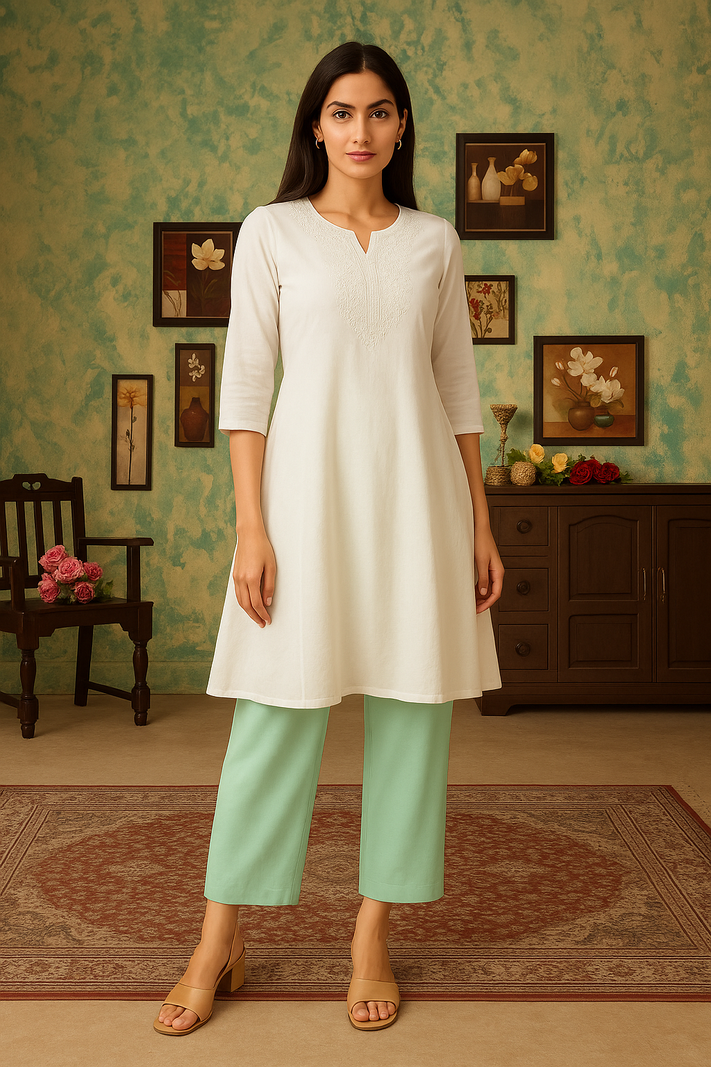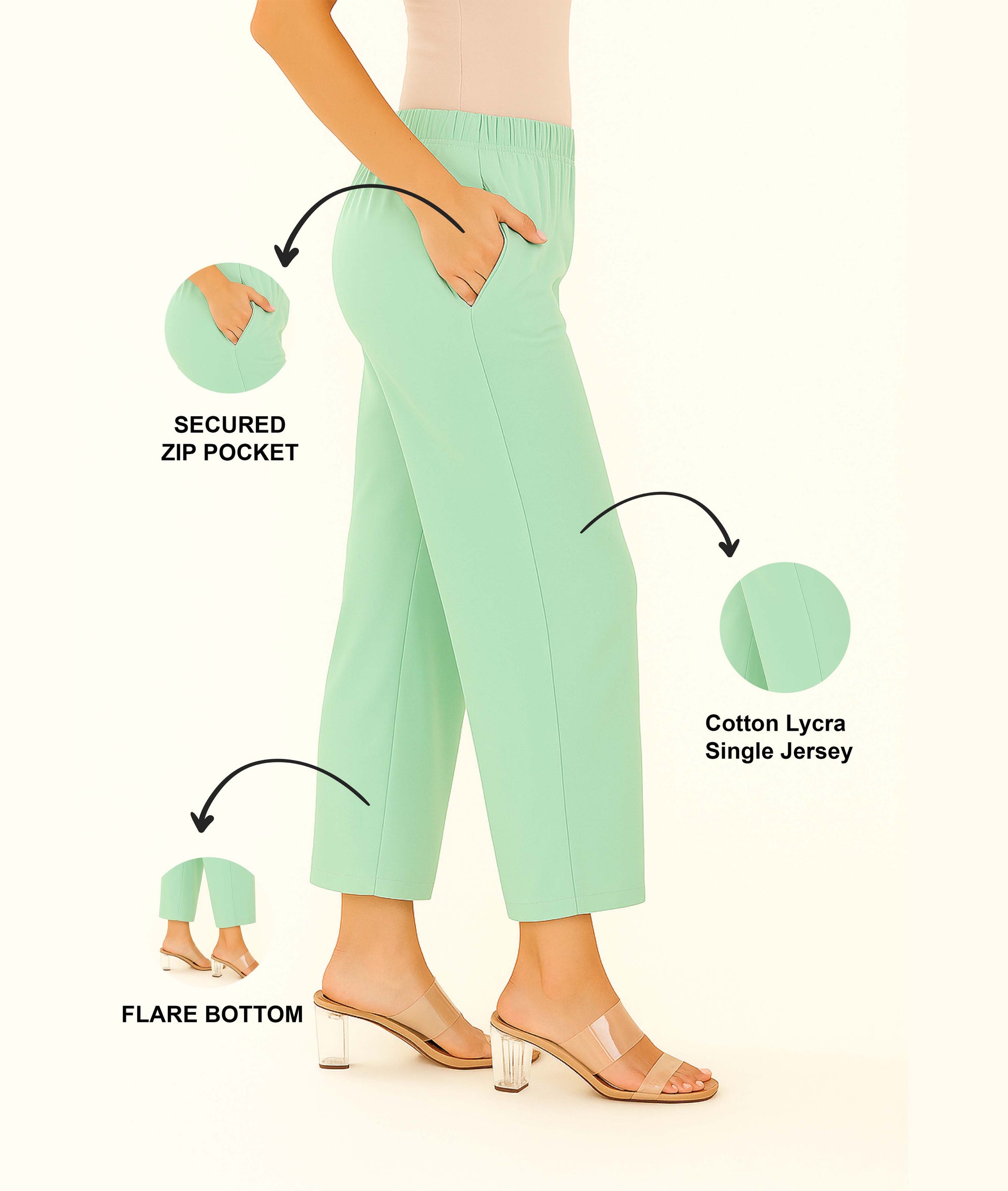 Playful and refreshing, the Women's Regular Fit Kiwi Flare Kurti Pant adds a cheerful splash to any wardrobe. With its lively green tone and fluid flare, this pant brings a youthful edge to ethnic styling. It’s made from breathable fabric to ensure day-long comfort. Style it with light or printed kurtas for a bright, casual ensemble. The relaxed fit ensures mobility, while the vibrant shade adds character to daytime events or weekend gatherings.