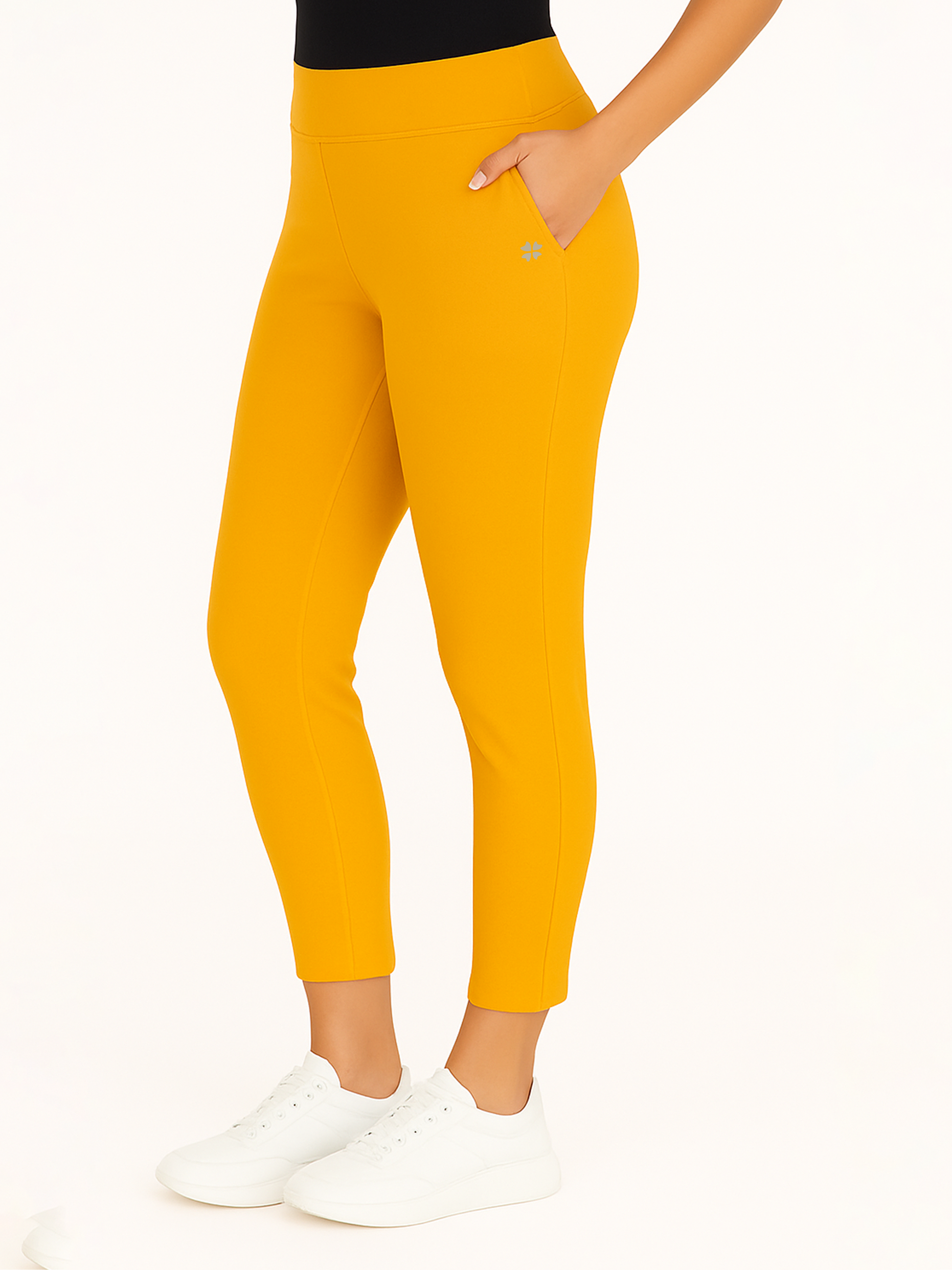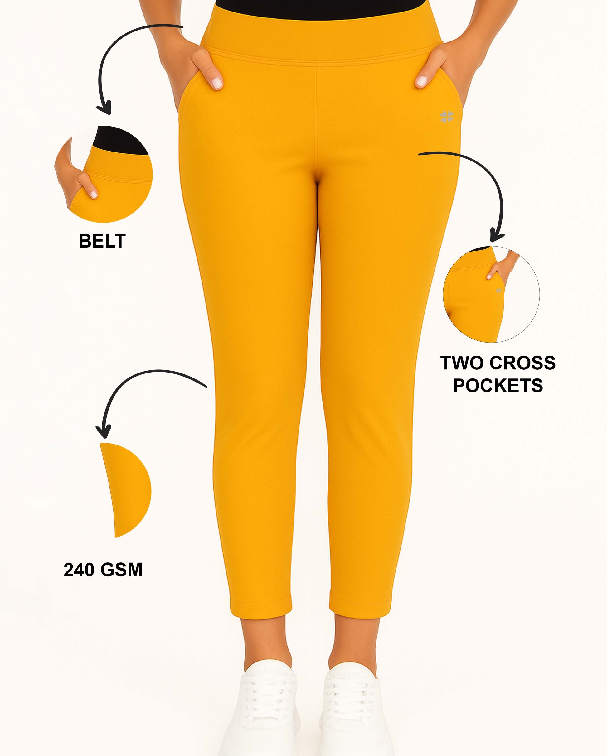 - Warm light mustard pants offer earthy, casual comfort daily.