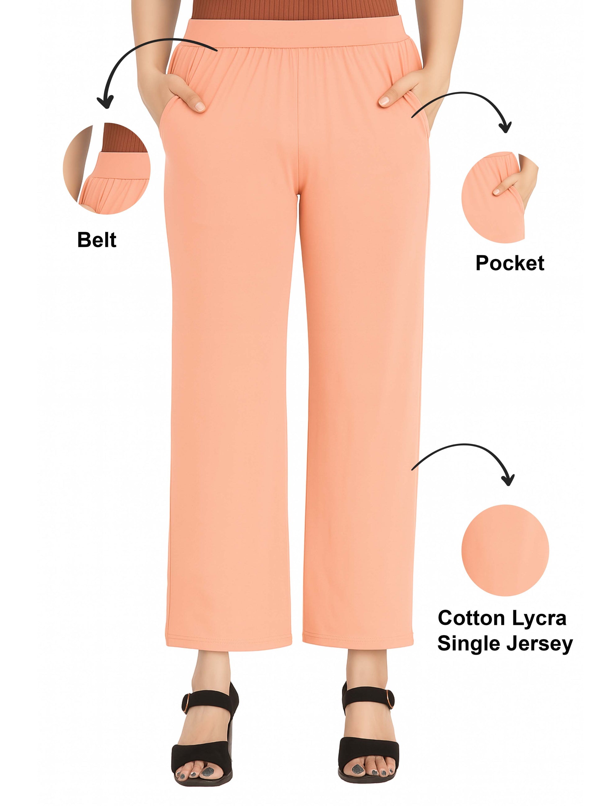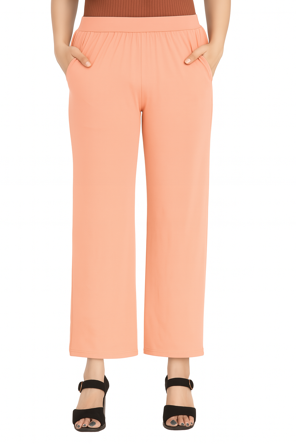 Redefine your ethnic essentials with the Women's Solid Peach Relax Fit Pant. Made from a soft-woven Cotton lycra, it features a gentle flare with roomy structure that feels effortless throughout the day. The solid peach shade is pairs beautifully with bright tones or tonal layers. It’s suits every setting from relaxed weekends to office hours. For those who value function in flowing form.